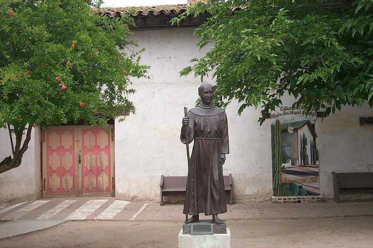 The statue is of Father Junipero Serra, president of the California Mission system when it first came into existence. Thought by the time Mission San Miguel was built father Serra was dead and did not live to see many of the later missions finished. Father Lasuen was president of the California Mission System at the time San Miguel was built. In 1795 at the urging of the Church Governor Diego Borica ordered an expedition of soldiers sent from Monterey to find a suitable place to build a mission between Mission San Luis Obispo and San Antonio, the party was accompanied by Father Buenaventure Sitjar from Mission San Antonio. The site was found and the Church was built. Father Sitjar and Father Antonio de la Conception Horra were installed as san Miguel's first missionaries. The Mission was not in existence for that long a time before the secularization but it did gain some success while it lasted. The Church is presently used as a parish church and as a State Historical Society Site.